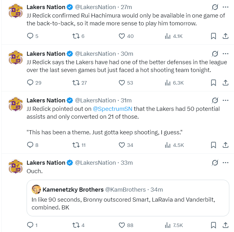 赛后湖人主帅雷迪克的采访这样说道:过去七场比赛我们的防守是联盟前列,但很可惜的是这场比赛我们遇上了手感火热的国王队。(雷迪克也透露八村垒背靠背只能出场一次,所以他会在明天对阵老鹰的比赛中复出)