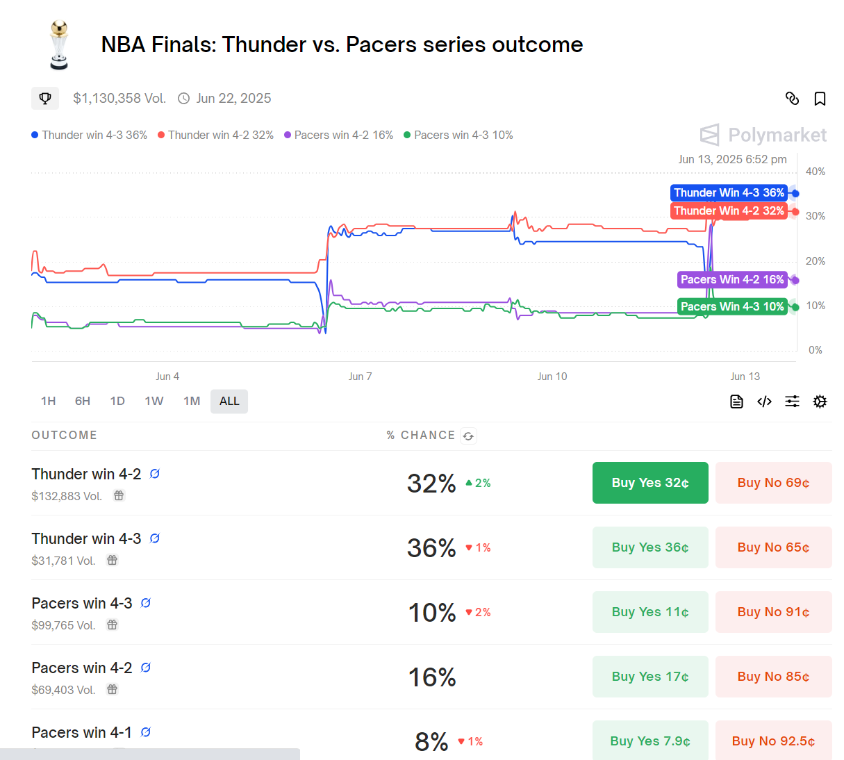 美媒Polymarket认为雷霆夺冠概率还有68%,步行者只有32%。大家觉得呢?
