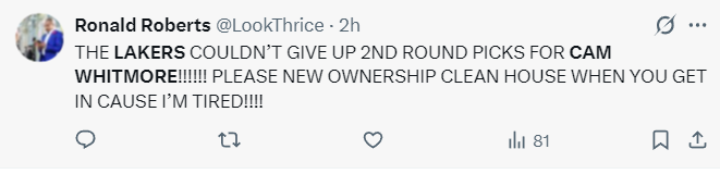 湖人球迷:湖人队不愿意放弃两个次轮签来换惠特莫尔,拜托新的管理层你们接手球队后好好整顿一下,我们已经受够了。