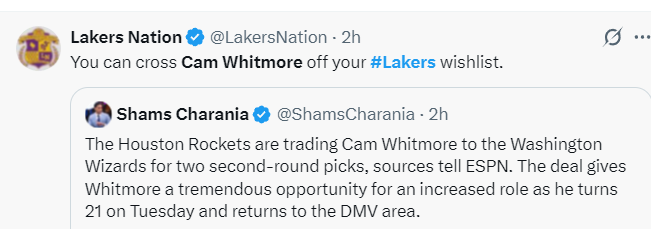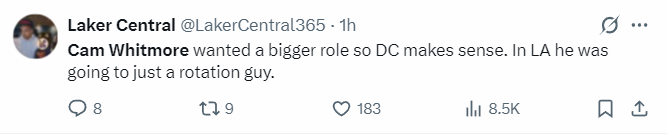 在白魔被送到奇才后,湖人球迷、湖人媒体都在热议球队未出手。(三天之前湖人队记安东尼-劳瑞恩就说白魔可能会进入KD大交易成为芬尼史密斯的筹码,当时湖人球迷十分开心,结果这份大交易的筹码曝光后并没有白魔,火箭是裸签了芬尼史密斯)